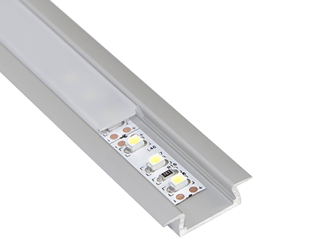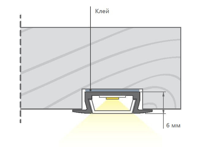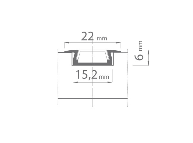 Врезной алюминиевый профиль для светодиодной ленты для установки во фрезерованные пазы. Используется с матовым или прозрачным экраном (рассеивателем) и заглушками. Размер 2000х22х6 мм.