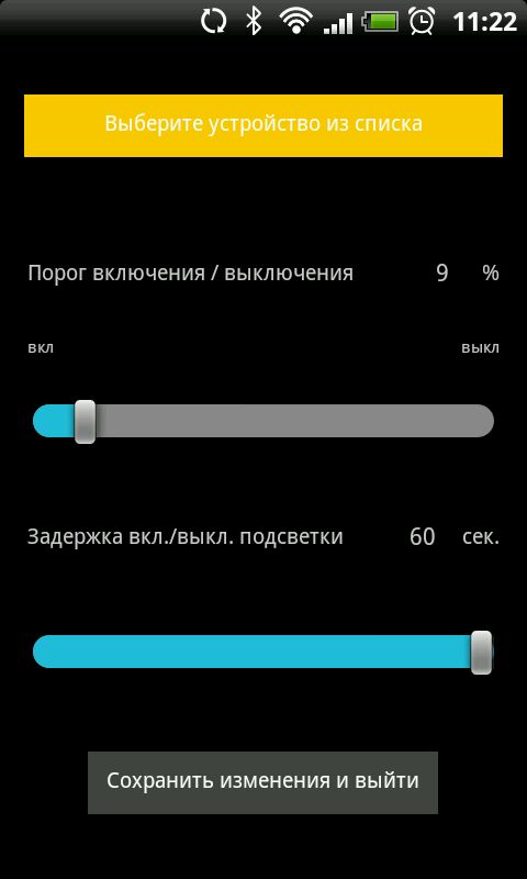 Установите порог включения/выключения подсветки и задержку включения/выключения в меню "Датчик освещенности";