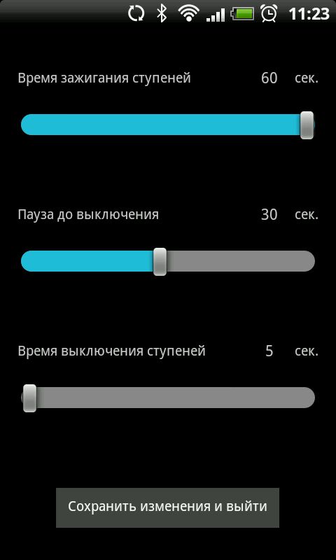 Настройте время зажигания ступеней, паузу до выключения и время выключения ступеней в меню "Установки";